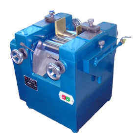 該設(shè)備由三個輥筒組成,裝在一個機架上,由電機直接帶動。一般輥筒間的轉(zhuǎn)動方向不同,前輥向前轉(zhuǎn)動,中輥向后轉(zhuǎn)動。輥子轉(zhuǎn)速前輥快、后輥慢。中間輥固定,前后兩輥裝在滑道上,有彈簧裝置,用手輪調(diào)節(jié)前后輥與中輥的距離。物料由后輥與中輥之間進入,受到輥筒的擠壓,產(chǎn)品顆粒變細(xì),然后由快輥帶出,快輥末端裝有刮刀,使物料與輥筒分離,落入收集桶內(nèi)。由于研磨過程產(chǎn)生大量熱量,各輥筒的中心是設(shè)計為空心結(jié)構(gòu),通水冷卻,保證產(chǎn)品質(zhì)量。