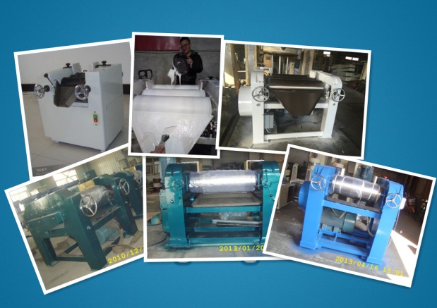 該設(shè)備由三個輥筒組成,裝在一個機架上,由電機直接帶動。一般輥筒間的轉(zhuǎn)動方向不同,前輥向前轉(zhuǎn)動,中輥向后轉(zhuǎn)動。輥子轉(zhuǎn)速前輥快、后輥慢。中間輥固定,前后兩輥裝在滑道上,有彈簧裝置,用手輪調(diào)節(jié)前后輥與中輥的距離。物料由后輥與中輥之間進入,受到輥筒的擠壓,產(chǎn)品顆粒變細(xì),然后由快輥帶出,快輥末端裝有刮刀,使物料與輥筒分離,落入收集桶內(nèi)。由于研磨過程產(chǎn)生大量熱量,各輥筒的中心是設(shè)計為空心結(jié)構(gòu),通水冷卻,保證產(chǎn)品質(zhì)量。